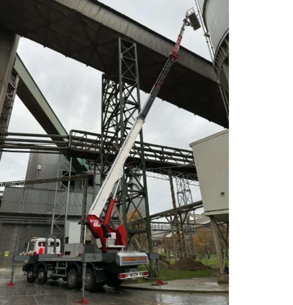 Podnośnik 40m posiada parametry pracy umożliwiające pracę poniżej poziomu, na którym stoi, np. malowanie mostu od dołu stojąc na nim.